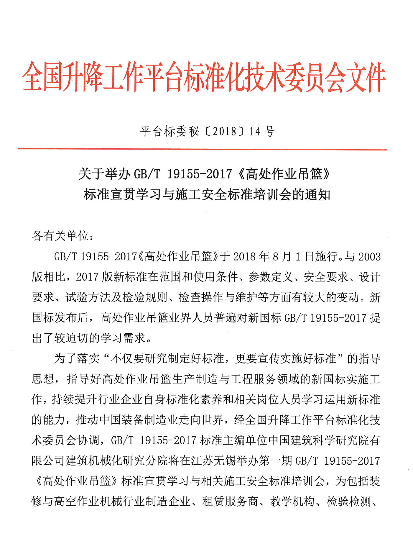 關于舉辦GB/T 19155-2017《高處作業吊籃》 標準宣貫學習與施工安全標準培訓會的通知