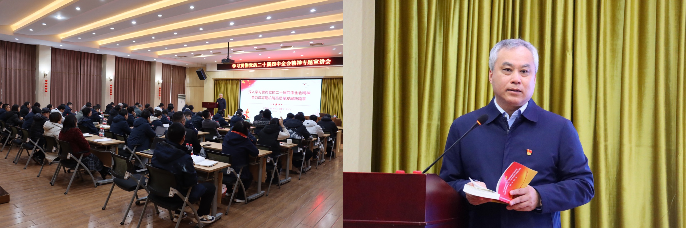 為深入學(xué)習(xí)貫徹黨的二十屆四中全會(huì)精神,12月30日上午,北京建機(jī)院舉辦學(xué)習(xí)貫徹黨的二十屆四中全會(huì)精神專(zhuān)題宣講會(huì),北京建機(jī)院黨委書(shū)記、董事長(zhǎng)宮劍飛作專(zhuān)題宣講。北京建機(jī)院黨委委員、紀(jì)委委員,職能部門(mén)、科技創(chuàng)新研究院及子公司正副職負(fù)責(zé)人,所屬黨支部書(shū)記及支部委員,建研檢測(cè)黨支部全體黨員,專(zhuān)兼職黨務(wù)工作人員,黨外人士,派遣制黨員,35歲以下團(tuán)員青年等160余人參加會(huì)議。